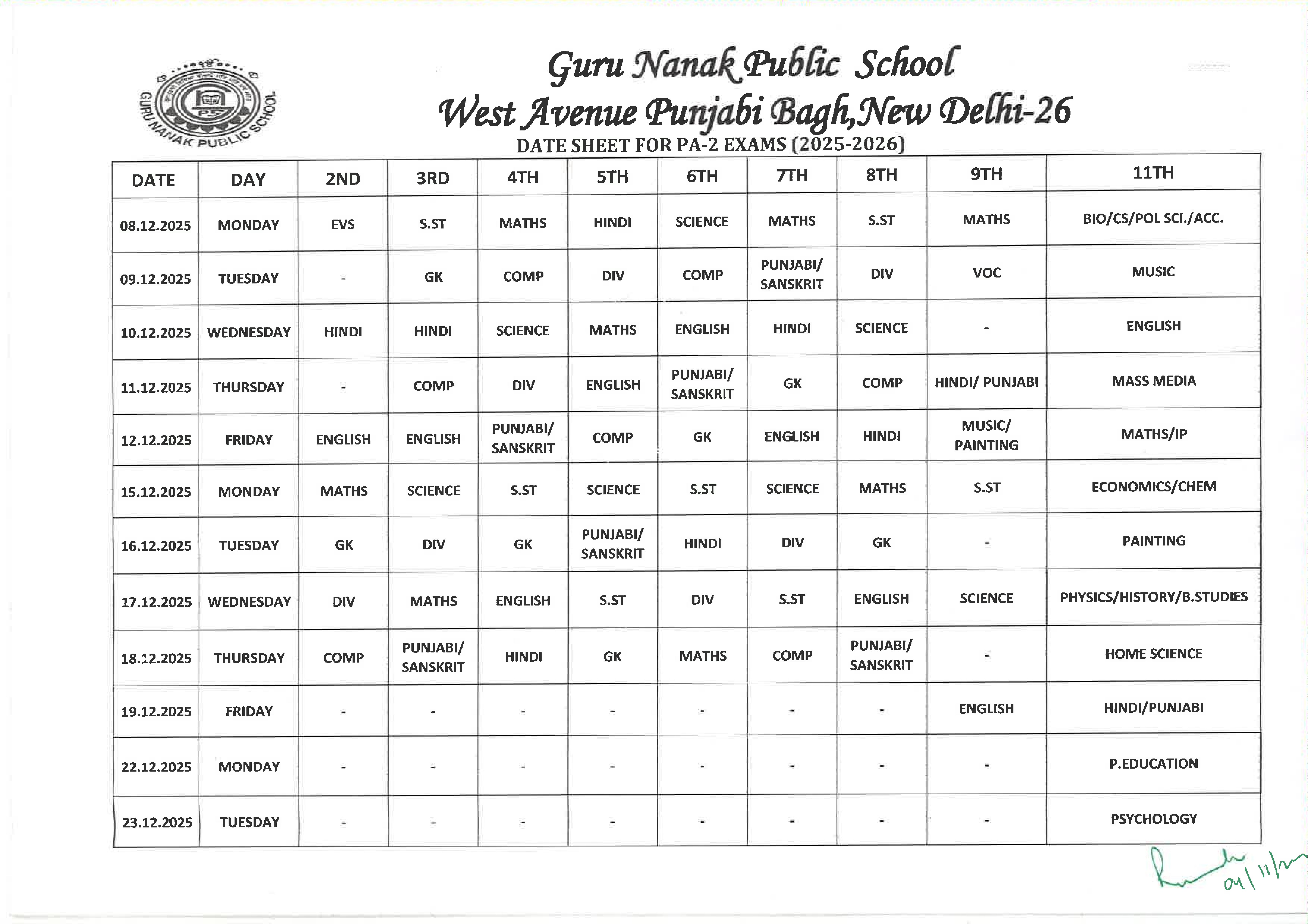 DATE SHEET PA-2 EXAMS 2ND TO 8TH & 9 & 11