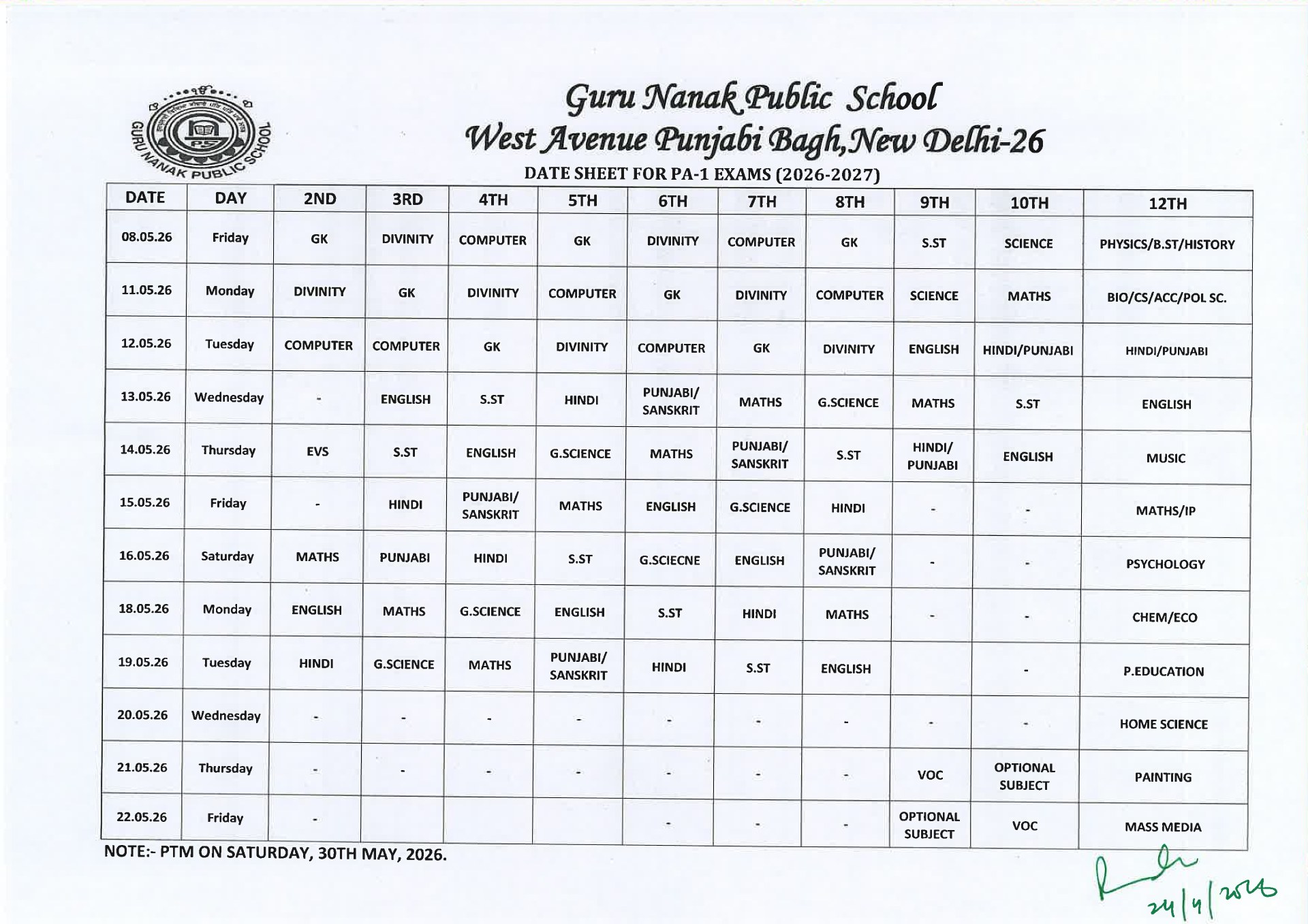 Date Sheet for PA1 Exams 2026 GNPS P Bagh